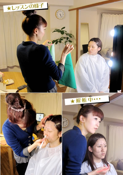 メイクについて今まで教わる機会がなく、どう仕上げたらいいかわからない。かと言ってメイクスクールに通うほどでもないし、メイク本を読んでもいまいちピンと来ない・・・。そんな方たちを対象としたレッスンです。受講した多くの方々から「今までよくわからなかったメイクのやり方が理解できた」と大好評です。化粧品、メイク道具などは準備がありますので手ぶらでも大丈夫。自分でメイクをして行けば、普段のメイク方法がわかってアドバイスしやすいそうです。