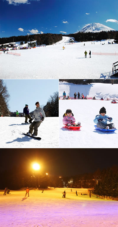 南都留郡鳴沢村、富士山のふもとに広がる「ふじてんスノーリゾート」は、スキーやスノーボードはもちろん、お子さまが雪遊びを楽しめるスノーエリアなども充実した“ 雪の総合レジャースポット ”。7つのコースと4基のリフトでレイアウトされたゲレンデには、スキー専用コースやスノーボード専用の「スノーパーク」もあり、初心者から上級者まで思う存分楽しむことができます。
