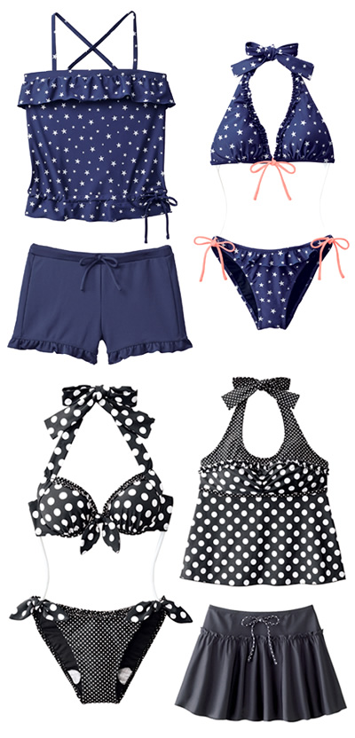 夜空のようなネイビーに、シルバーラメの星をちりばめて。ビキニ&ショーツのリボンは取り外し可能。裾フリルのショーパンでアクティブに。取り外し可能なボリュームパッド付きで、美胸メイクも思いのまま。