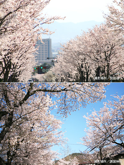 JR甲府駅北口から武田通りと護国神社から県立こどもの国にかけての愛宕山スカイラインには約1000本の桜並木があり、桜のトンネルのように咲き誇ります。また4月5日には護国神社春季例大祭も行われ、参拝者や花見を楽しむお客さんで賑わいをみせます。