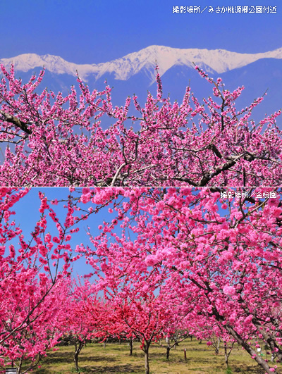 笛吹市桃の花祭りは、市内の旧町村の春祭りの総称です。 各地域ごとに様々なイベントが行われています。この時期はもう町中が桃の花でピンク一色で、うきうき気分も盛り上がります。