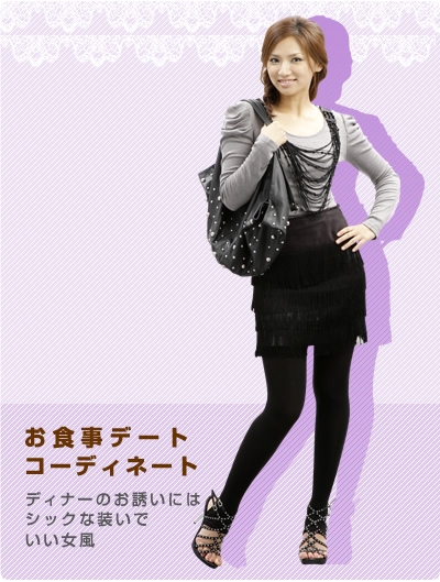 モノトーン系のアイテムは繊細なデティールにこだわって、女性らしさを演出。ディナーにぴったりのコーデです。ポイントは流行のパワショルのシルエットが女らしいカットソー。胸元のデコビーンズは煌びやかな存在感が素敵です。また歩くたびにフリンジが揺れるミニスカートもセクシー。女度があがるアイテムでスマートに仕上げます。
