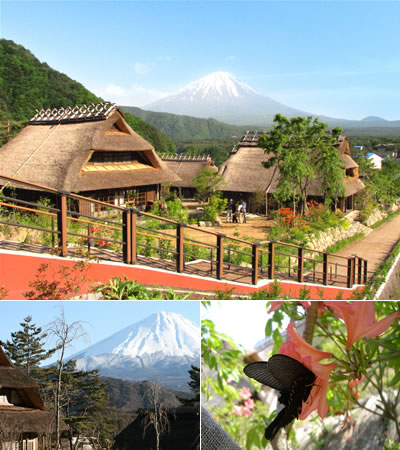 根場はもともと、西湖、青木ヶ原樹海、そして富士山を一望できる富士五湖随一のロケーションを持つ地区として知られていました。集落再生を目指してスタートした「西湖いやしの里根場創出事業」では、そんな根場のゆるやかな傾斜地に茅葺き家屋の集落を創出させようとしたもの。オープン3周年目となる平成20年7月には来場者が早くも50万人を突破。テレビや新聞でもとりあげられて、観光スポットとして一躍注目をあびるようになりました。現在ではすでに20棟ができあがり、平成22年4月にリニューアルオープンの予定となっています。(リニューアルオープンに伴い、料金変更等も予定しております)
