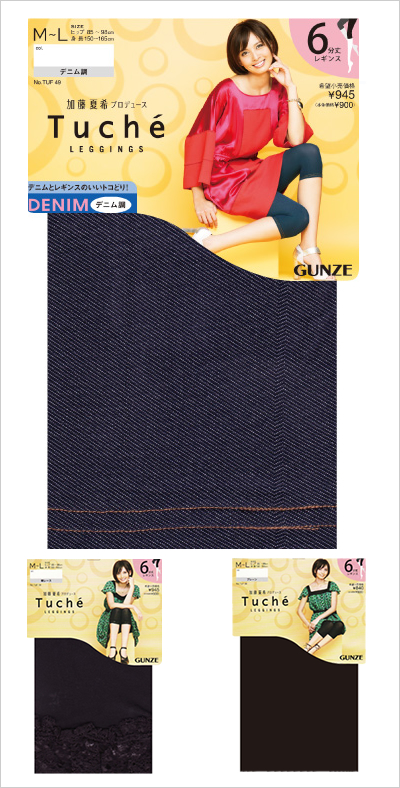 高いファッション性で トレンドをリード 大人世代の神田うの、ナマ脚世代の有村実樹、そしてキャリア世代に向けた加藤夏希の3世代シスターで年代別にレッグウェアを提案する Tuché から、JJ モデルとして、また女優としても活躍する加藤夏希プロデュースのレギンスにデニム調が新登場。 シンプルなデザインでコーディネートしやすく、ヘビーローテーション間違いなし。 Tuché (トゥシェ) ■デニム調レギンス 6分丈 TUF49 ¥945(税込) サイズ:M~L、L~LL カラー:インディゴテニム/ブラックデニム ■裾レースレギンス 6分丈 TUF39 ¥945(税込) サイズ:M~L、L~LL カラー:ブラック/マイルドグレー ■プレーンレギンス 6分丈 TUF38 ¥840(税込) サイズ:M~L、L~LL カラー:ブラック/マイルドグレー