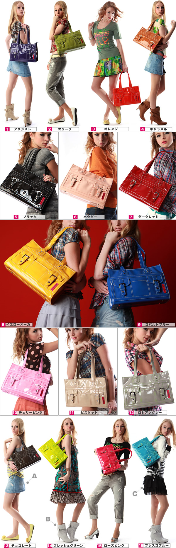 ナタリア 全10色(スペシャル・カラー含む) 品番:MA-362 4,980円(税込) ●主素材:高級合成皮革/中国製 ●サイズ:縦22×横39.5×マチ18×持ち手高さ16(cm) ●重量:約550g ●外側ジッパーポケット×1/内側ジッパーポケット×1/オープンポケット×2 |