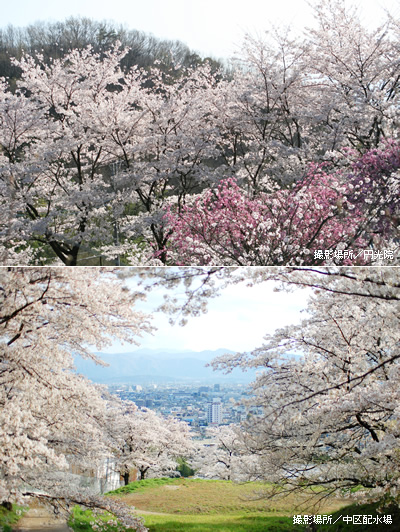 愛宕山の高台にある配水場で、70本のソメイヨシノはじめとする桜と眼下に広がる甲府盆地、そして天気のいい日には富士山と桜の素晴らしい眺めを堪能できます。