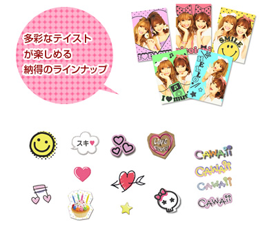 「オシャレ」「ポップ」などから、自分のイメージに合うジャンルを選んで、直感的にイメージ通りの落書きコンテンツを探すことができます。また、同じジャンルの落書きコンテンツを使えば、簡単に統一感のある落書きが楽しめます。シールの完成度がさらに高まります。